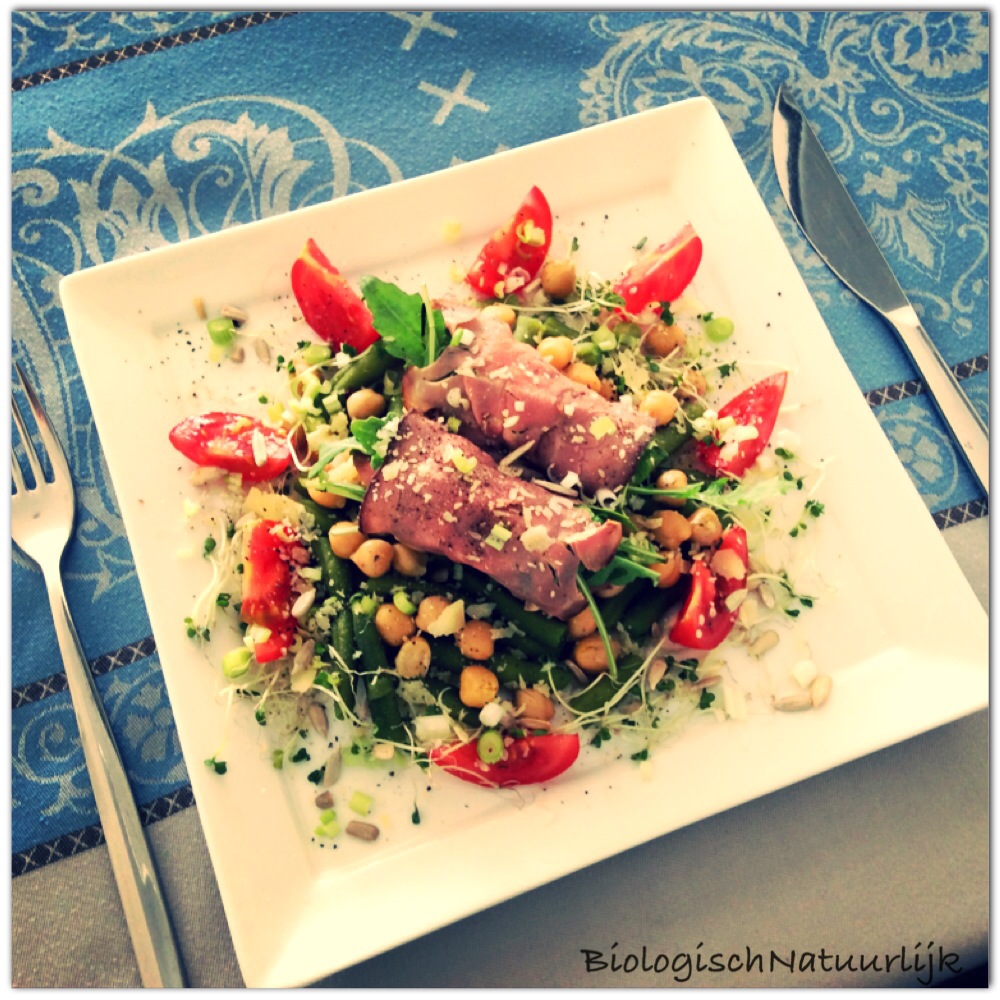 Ik had nog best wat restjes in de koelkast liggen. Sperziebonen, kikkererwten, bosuitjes, kiemen en rucola. Daar valt vast wel iets mee te maken. En voilà!
