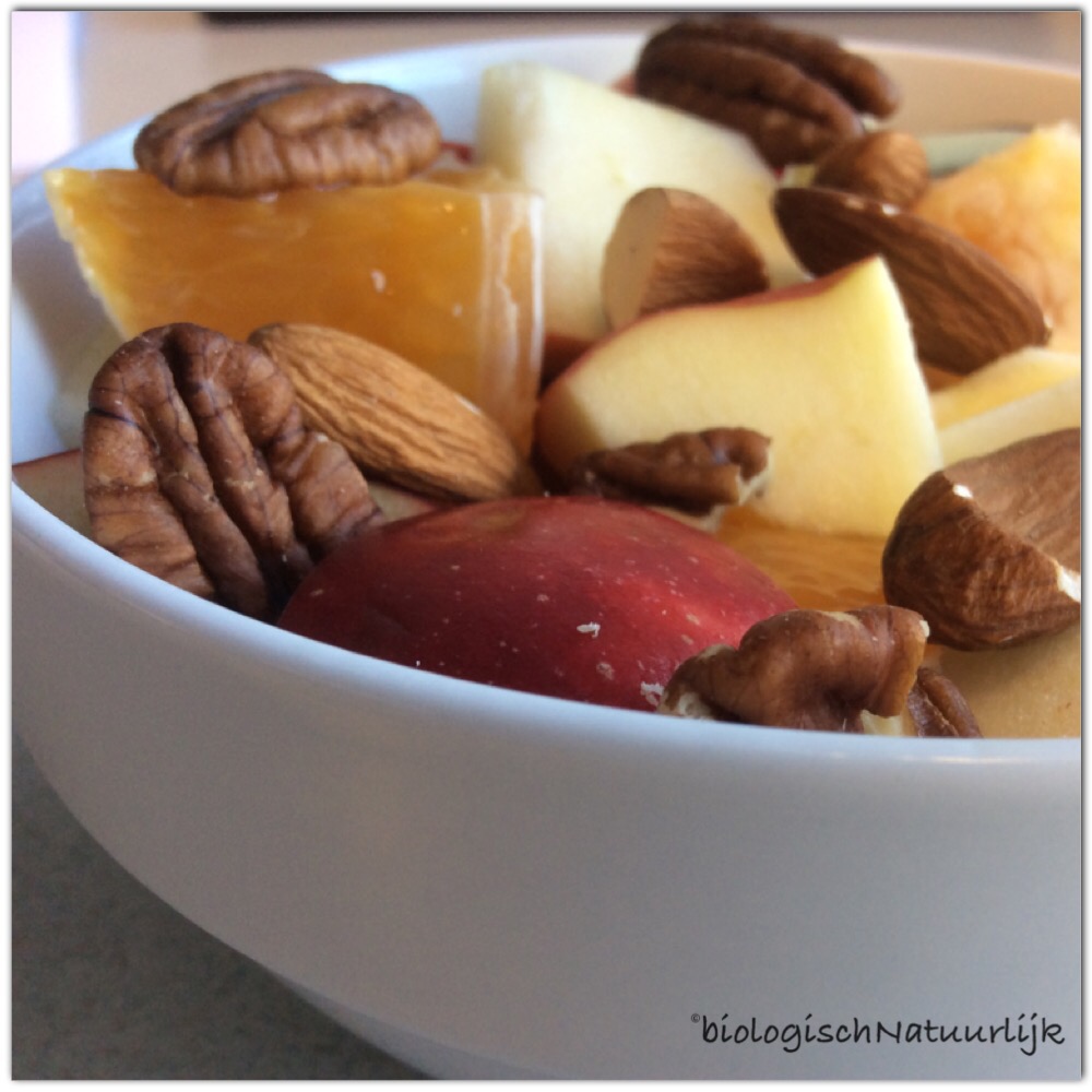 Door fruit te combineren met nootjes (vetten) voorkom je enorme pieken in je bloedsuikerspiegel.