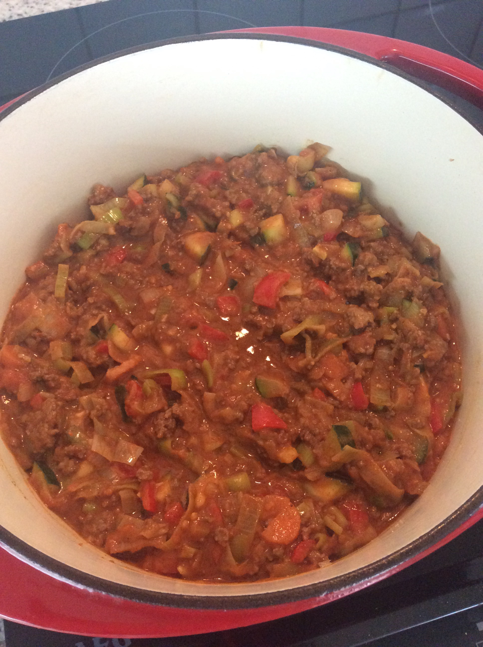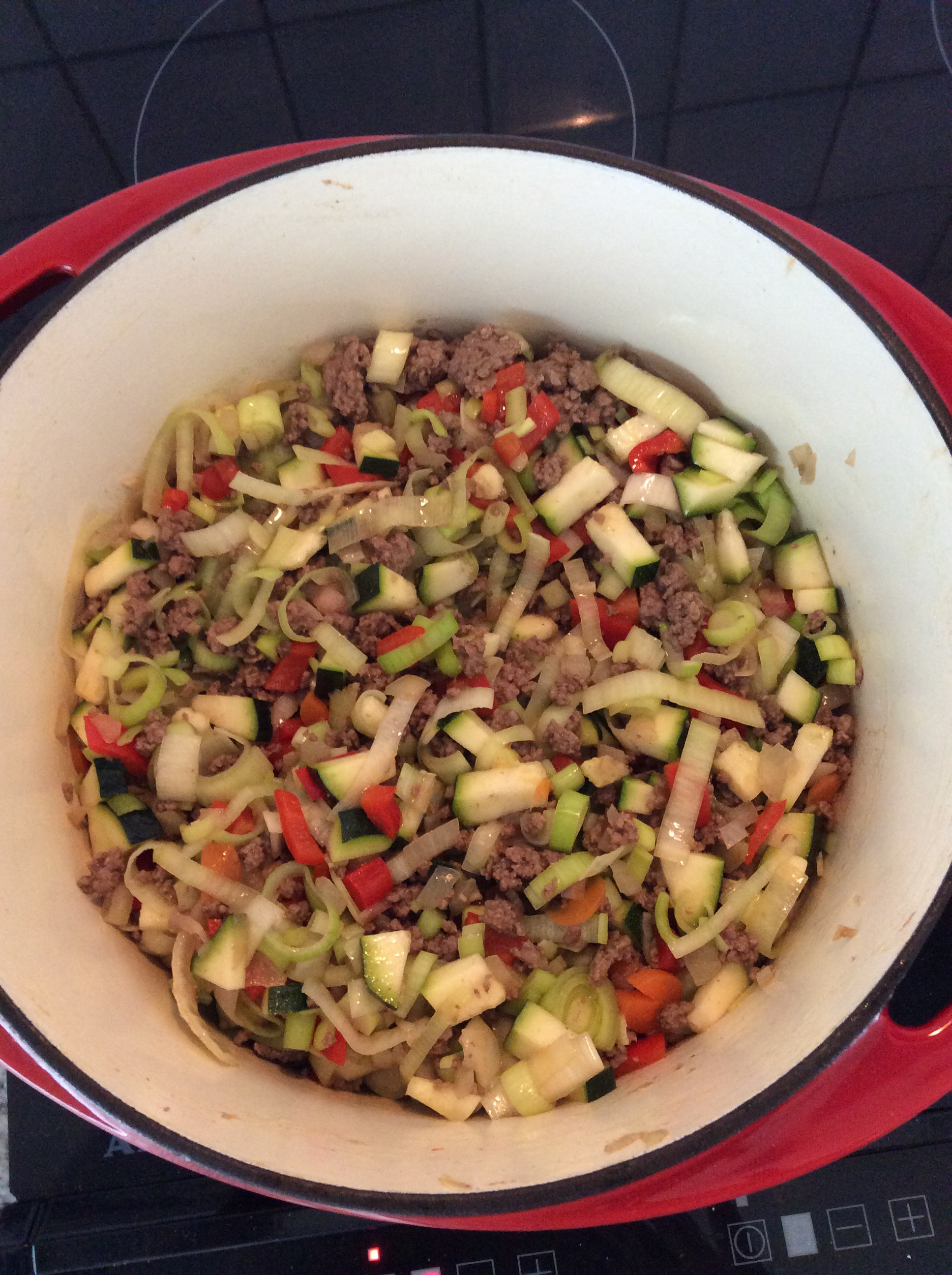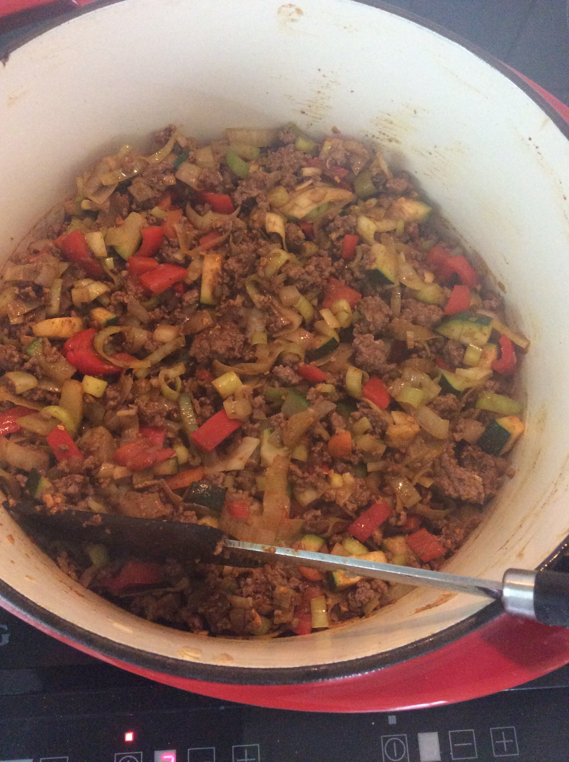 Snijd de ui, knoflook, paprika, wortel en courgette in stukjes. Doe de gesnipperde uitjes in een voorverwarmde pan met een flinke scheut olijfolie en fruit tot ze glazig zijn. Voeg het gahakt toe en rul dit eventjes, voeg eventueel wat zout toe.Voeg vervolgens ook de knoflook en de andere groenten toe. Roer voorzichtig om strooi het kruidenmengsel er dan overheen.