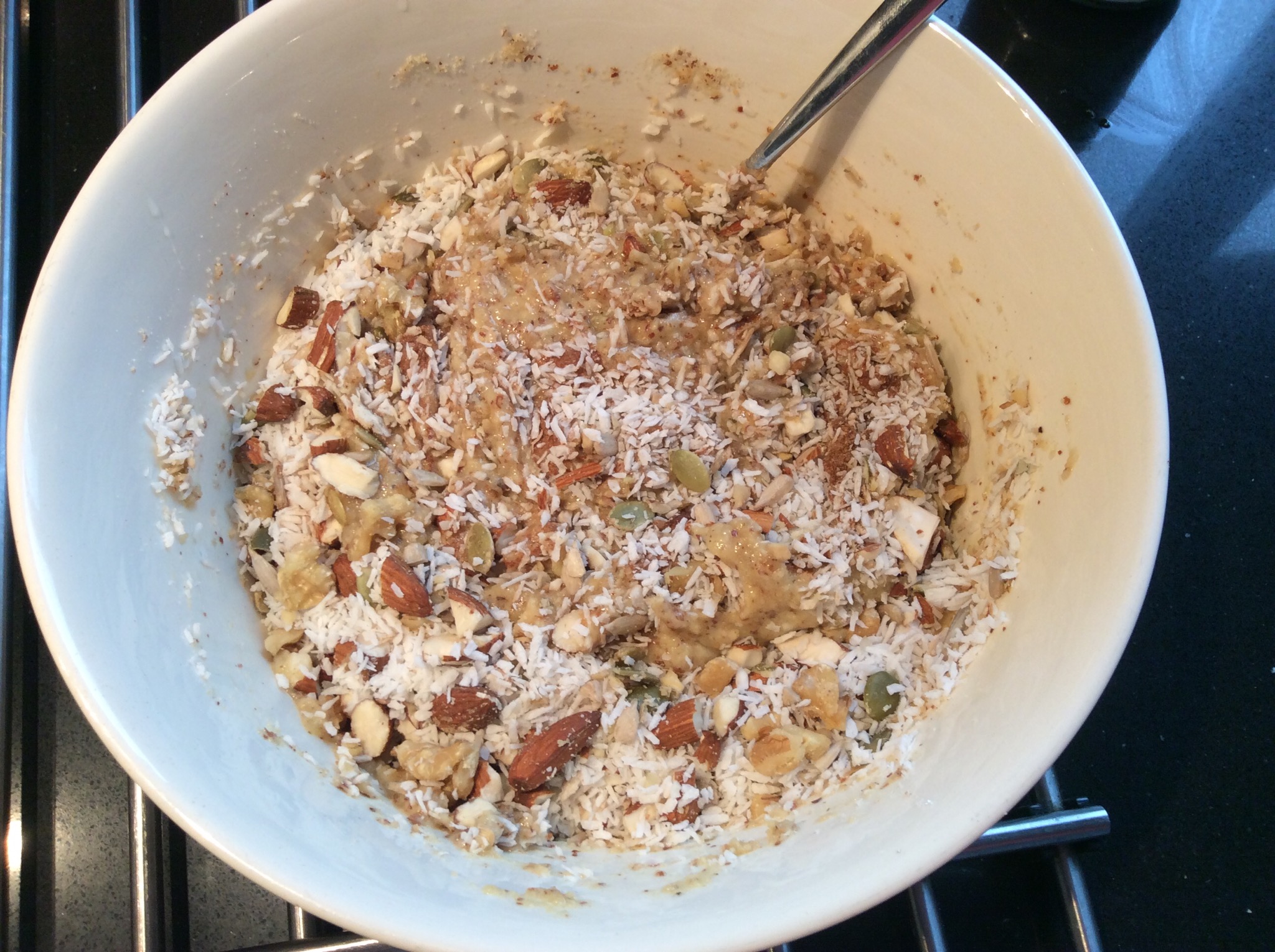 75 gram gemengde noten, bijvoorbeeld amandelen, walnoten, paranoten, hazelnoten, maar je kunt ook pompoenpitten of zonnebloempitten gebruiken