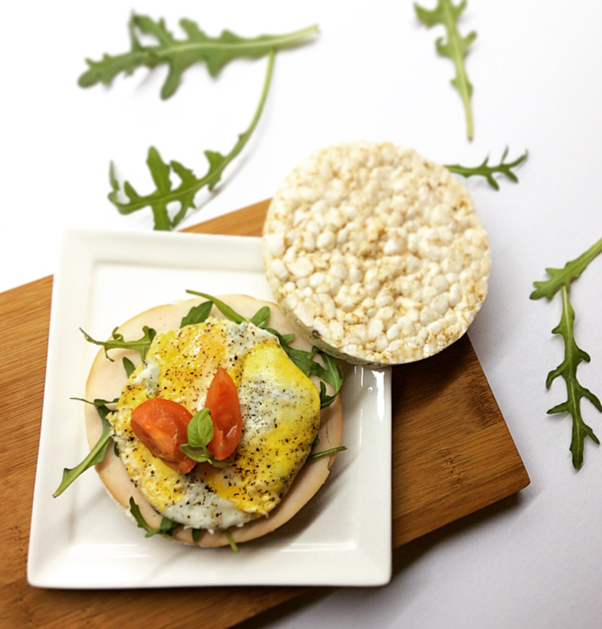 De tweede wafel belegde ik met een plakje kipfilet, gebakken eitje (de rest van het ei at ik apart op), rucola en tomaat.